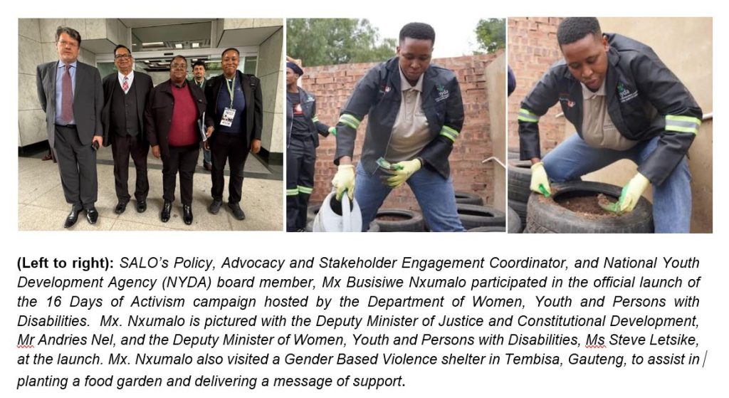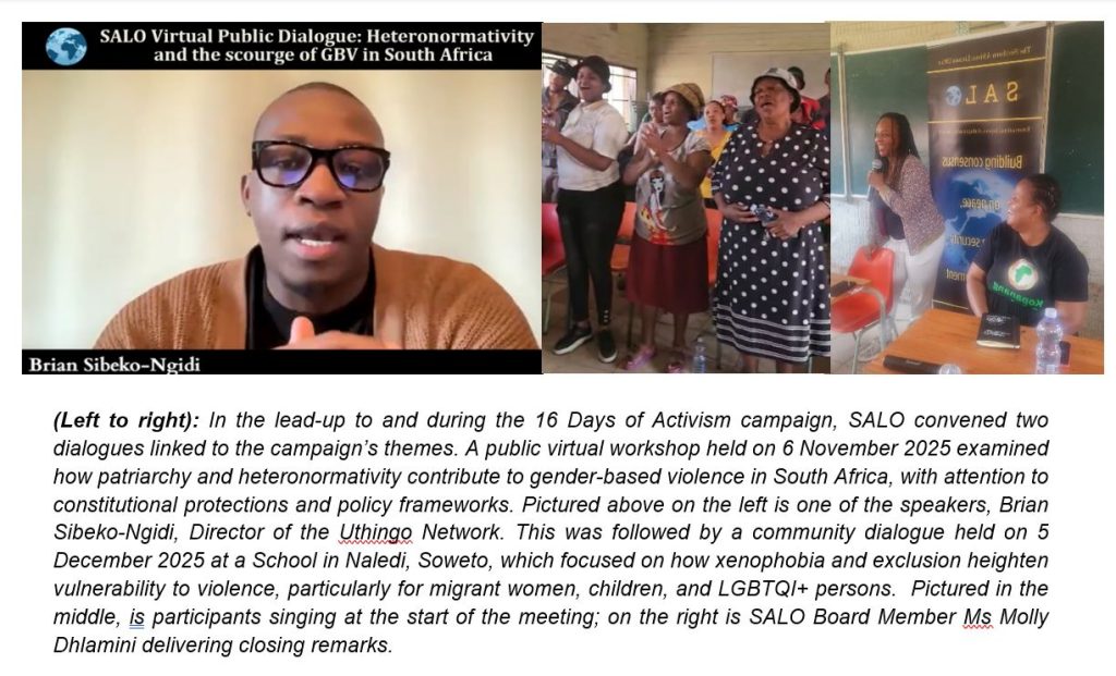 The 16 Days of Activism for No Violence Against Women and Children closely aligns with SALO’s core values and its long-standing commitment to advancing human rights, dignity, and social justice. Addressing gender-based violence is central to building inclusive and democratic societies and is closely connected to SALO’s broader work on equality, protection, and the rights of marginalised communities. During the campaign period, SALO’s engagement spanned national participation, dialogue-based reflection, and community-level action, contributing to awareness raising and public discourse on gender-based violence and the protection of dignity and rights.