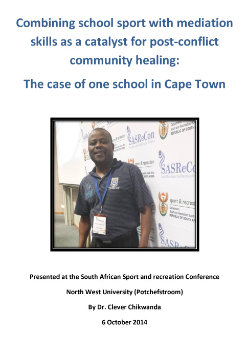 Recent Reports and Publications South Africa Combining school sport with mediation skills as a catalyst for post-conflict community healing: The case of one school in Cape Town October 29, 2014November 29, 2014 SALO Clever Chikwanda, recently made a presentation at the South African Sport and Recreation Conference (SASReCon) at the North West University-Potchefstroom. Download abstract below: