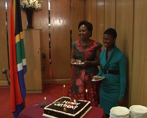 Ambassador Lindiwe Zulu (President Jacob Zuma’s International Relations Advisor and Spokesperson for the SADC mediation team for Zimbabwe) with Rebone Tau (SALO Liaison and Advocacy Co-ordinator) posing with an exquisite shared birthday cake as their birthdays are on the same day: 22th April