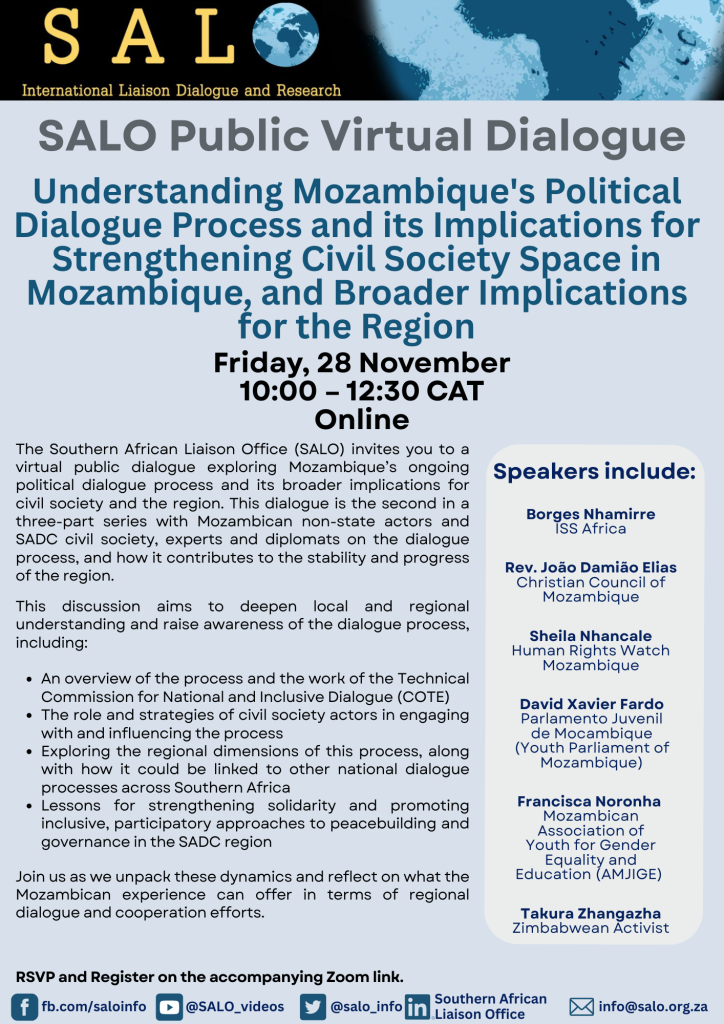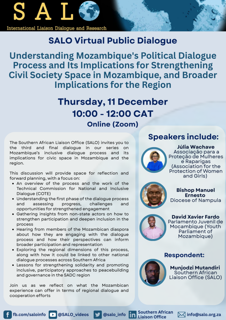 Between October and December 2025, the Southern African Liaison Office (SALO) convened a series of four dialogues examining Mozambique’s National and Inclusive Dialogue process. Together, these engagements created a structured space for Mozambican civil society actors, faith leaders, youth representatives, regional analysts, and partners from across Southern Africa to reflect on the dialogue’s evolution, its inclusivity, and its wider regional significance.