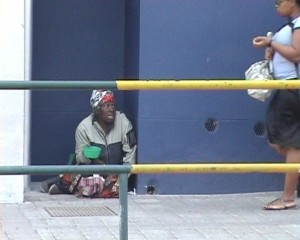 A woman begging on a street of the Swazi capitol as poverty mounts. (2010) Still from footage taken by SALO staff